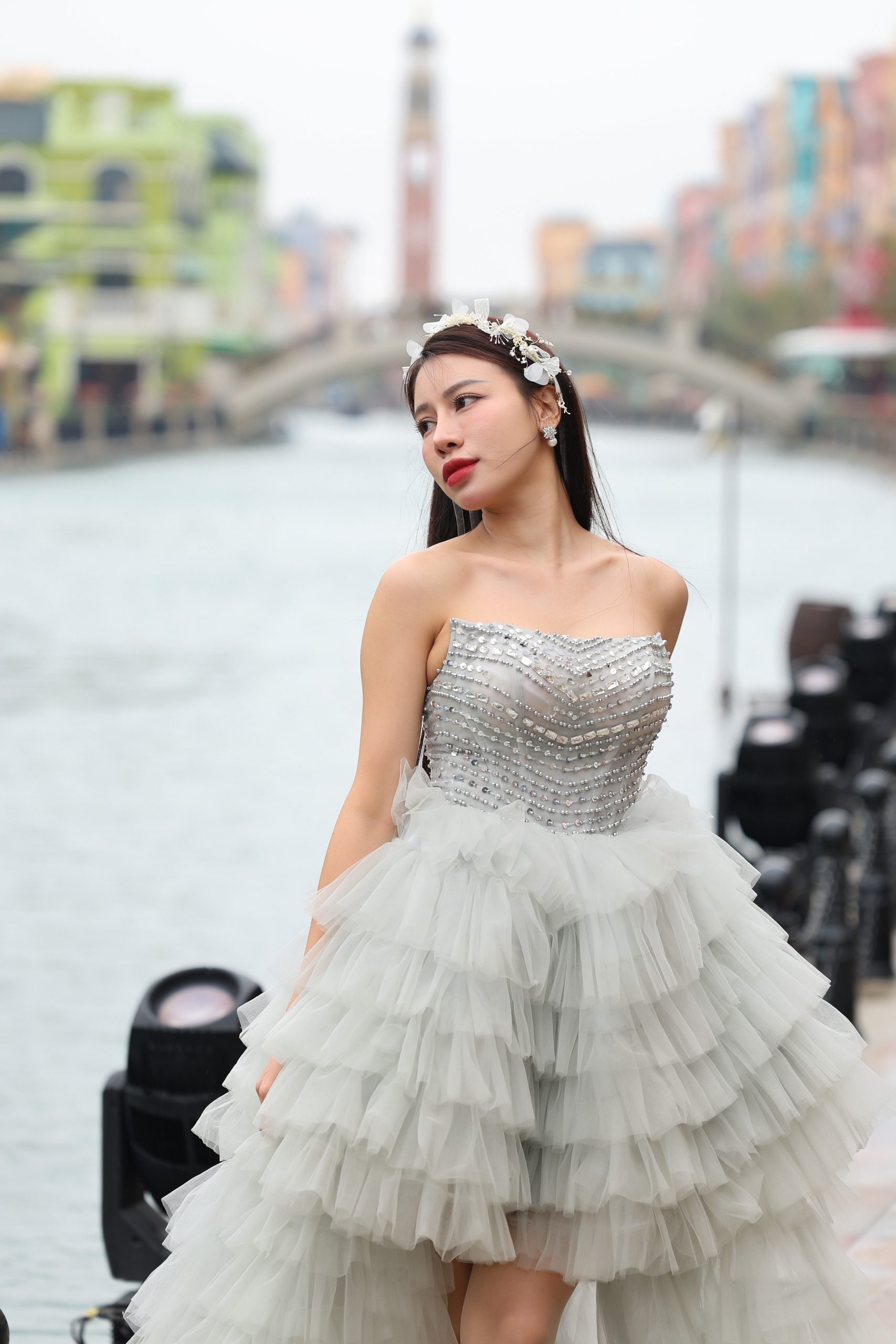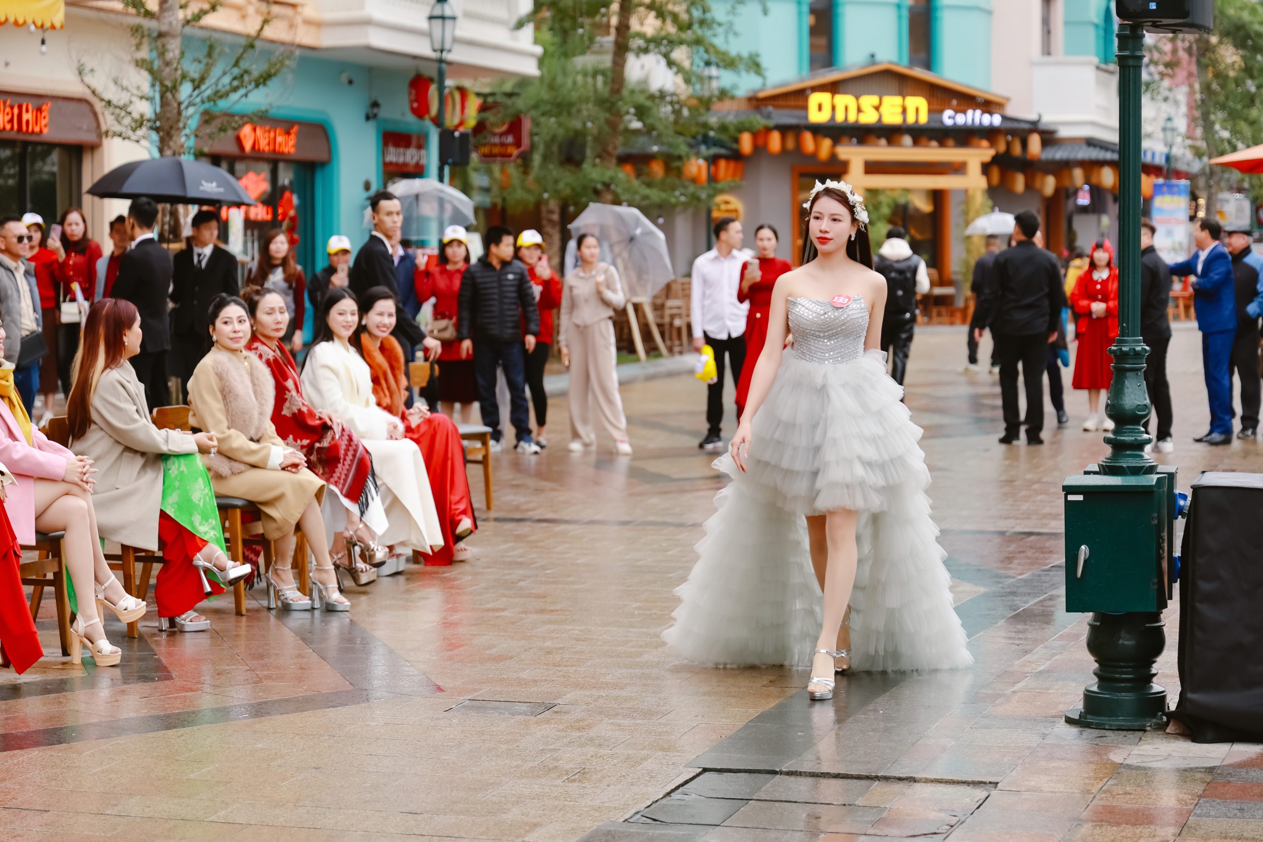 Mỗi bước đi trên sàn catwalk như một dấu ấn thời gian, Bùi Thị Huyền làm sống động không gian với vẻ đẹp đầy quyến rũ, đầy khí chất, tựa như một bức tranh nghệ thuật giữa lòng Vinhomes.